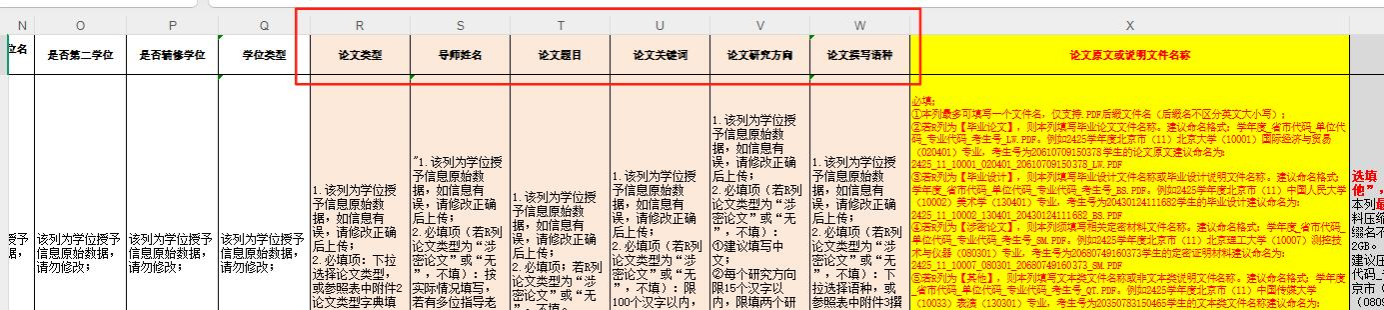 【R-W】列(模板中粉底色列)为学位授予信息原始数据,如信息有误,可修改正确后 , 标黄 ( 修改后的信息务必与论文原文保持一致 ) 。