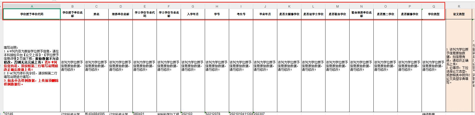【A-P】列(模板中无底色列)为学位授予信息原始数据,不允许修改。