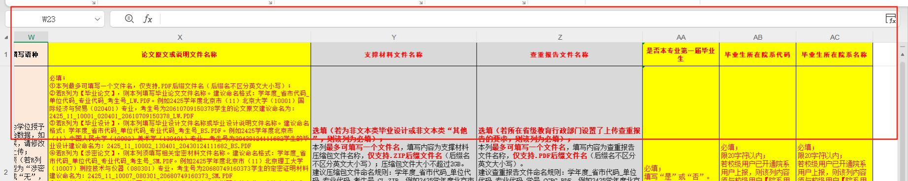 【X-AC】列(模板中标黄 / 灰底色列)为需补充数据, 指导教师 根据论文情况进行补充(其中 AB-AC 仅可填写本院系代码及名称)。