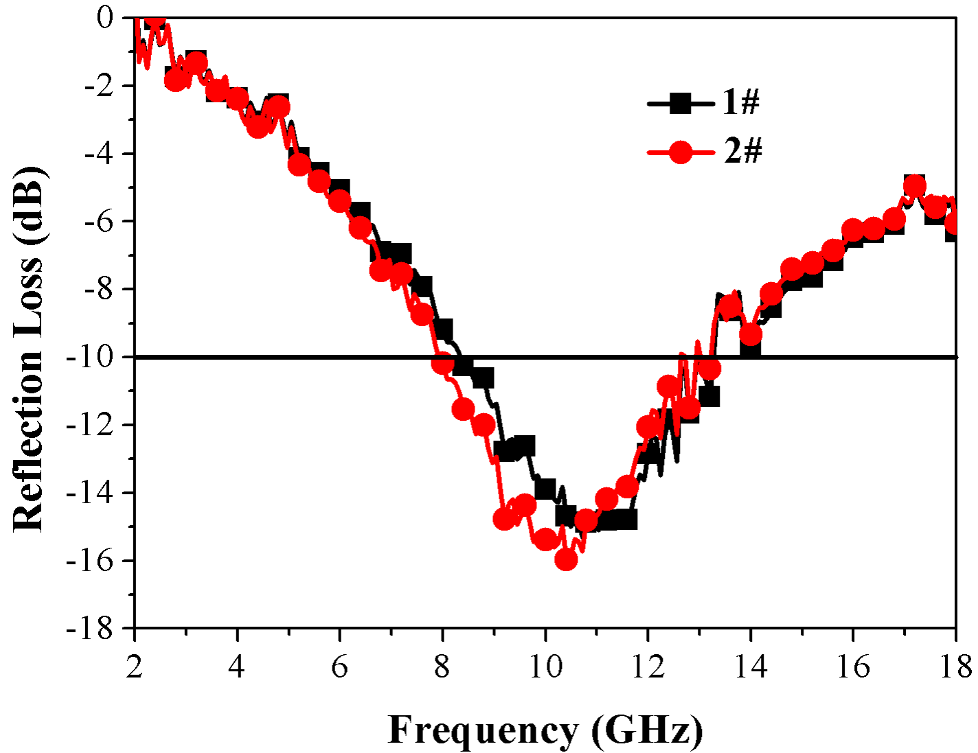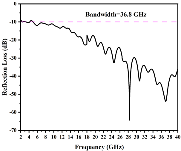 (5)成功制备出厚度≤45 mm,体密度≤0.07 g/cm3的轻质、高强吸波复合材料。在2~40 GHz内有效吸收频宽可达36.8 GHz。