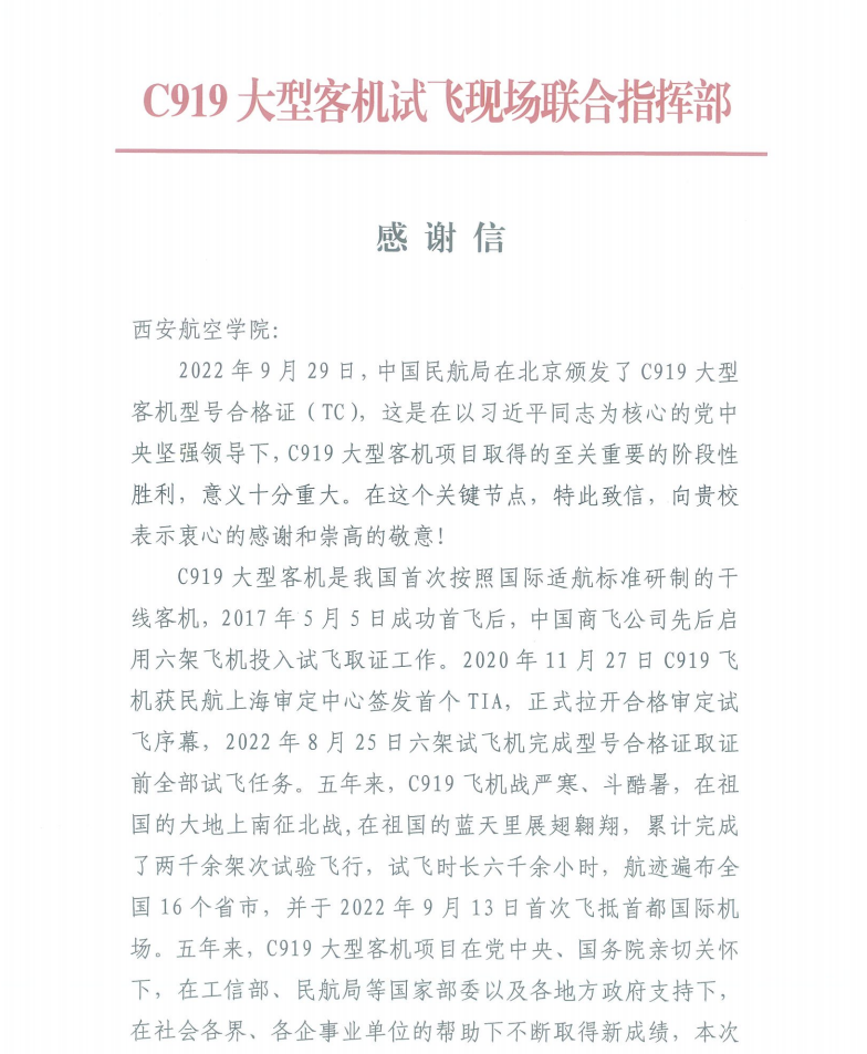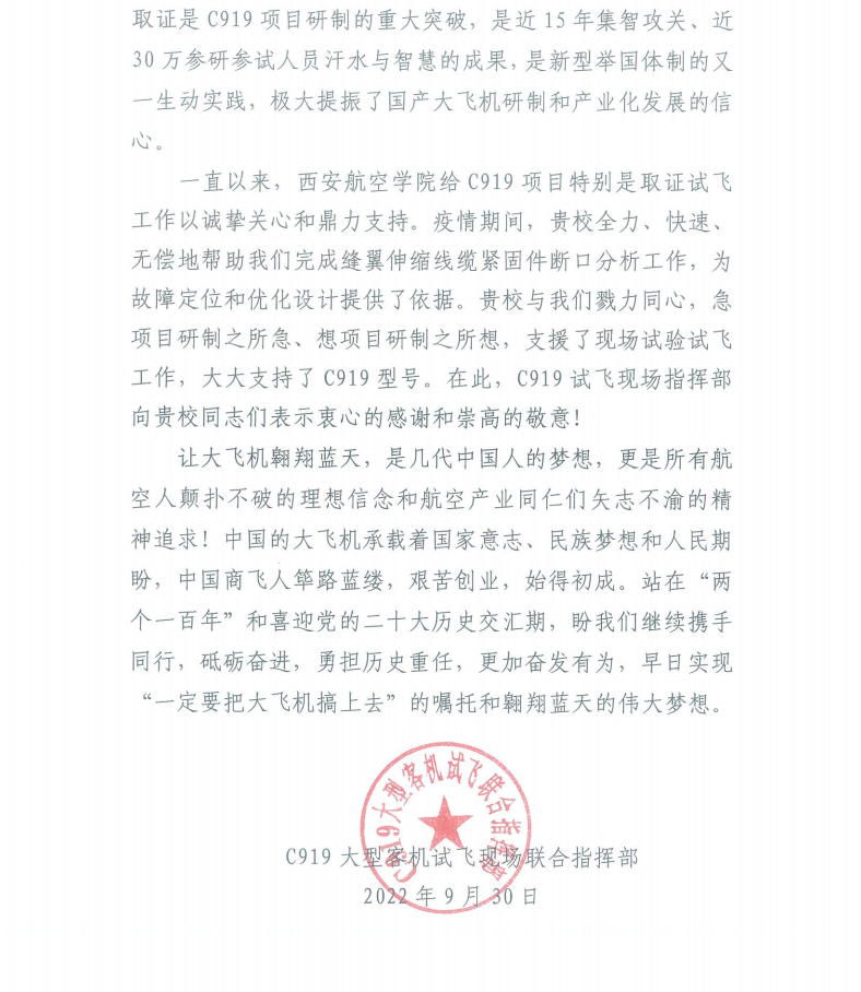 C919大型客机试飞现场联合指挥部在感谢信中表示,365英国上市公司官网与他们勠力同心,急项目研制之所急,想项目研制之所想,支援了现场试验试飞工作,大大支持了C919型号。希望能够继续与365英国上市公司官网携手同行,砥砺奋进,永担历史重任,更加奋发有为,早日实现“一定要把大飞机搞上去”的嘱托和翱翔蓝天的伟大梦想。(文、图/365上市集团官网)