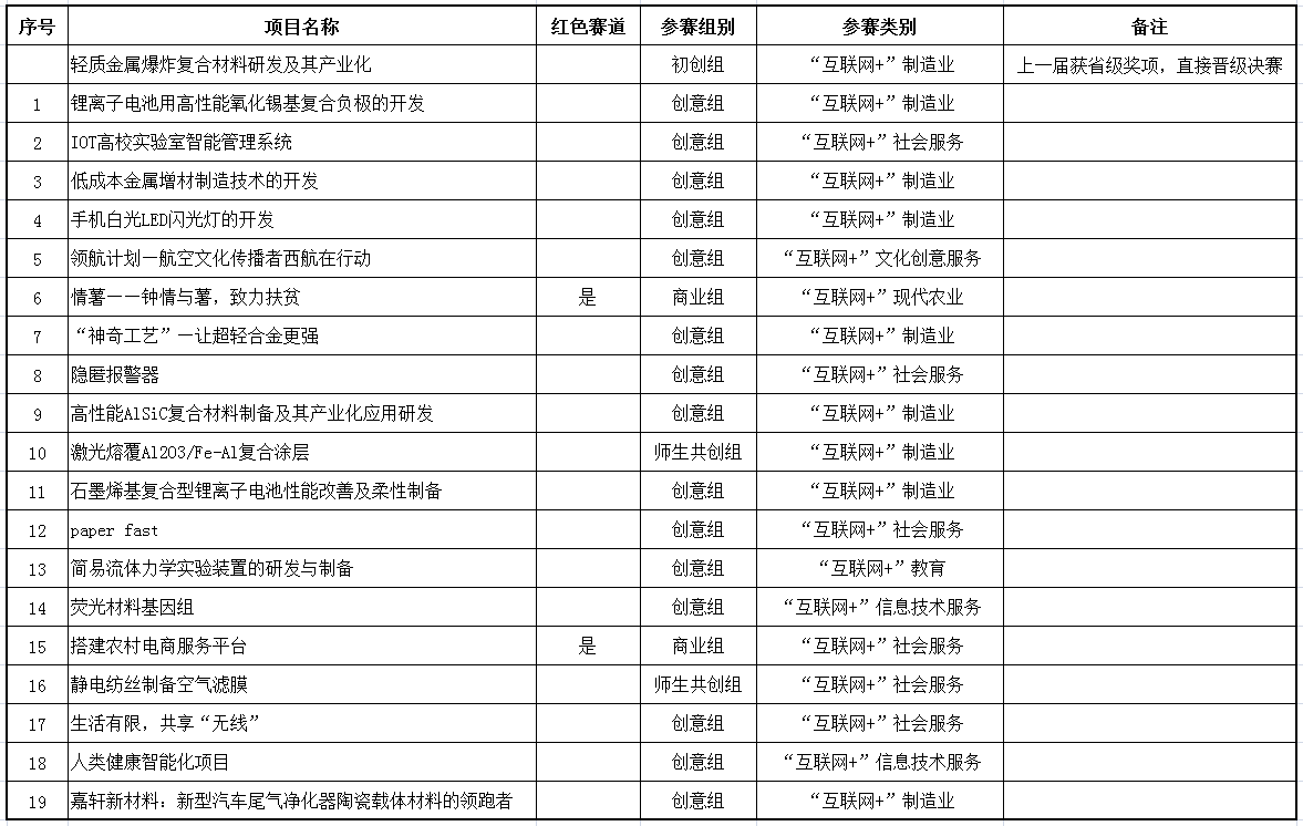 其中《轻质金属爆炸复合材料研发及其产业化》一项为上一年度省赛获奖项目,依照《通知》规定可直接晋级校级决赛,不占用复赛名额。