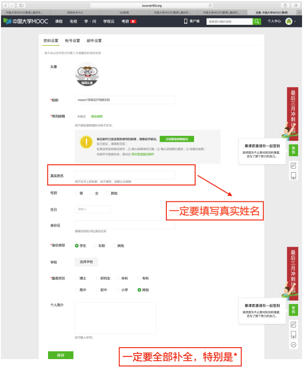 (1)各二级公司(部)老师需注册中国大学MOOC平台上注册,注册步骤依照中国大学MOOC账号注册指南(附件1),特别注意:在完善个人信息时请在资料设置中将头像、真实姓名以及所有带“*”的都完善,申请账号后完成个人设置后将相应个人信息填写至中国大学MOOC账号汇总表(附件2)。