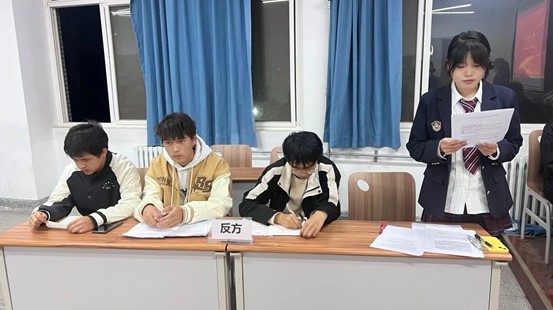 本次比赛共分为六个环节。比赛首先由主裁阐述辩论赛规则与细则,几轮比赛下来,正方观点犀利,言辞凿出,犹如利箭直插问题核心;反方也不甘示弱,据理力争,巧妙反击,最为精彩的就是自由答辩环节,双方在思维的碰撞中,绽放出智慧的火花,在最后的评委点评环节中,评委们对此次辩论给出了中肯的建议。