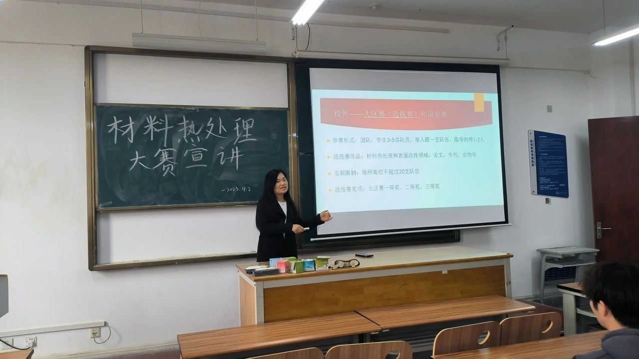 宣讲会上,鲁老师围绕大赛的背景意义、赛程安排、参赛要求及评审标准等方面进行了详细介绍。她指出,材料热处理是提升材料性能、优化制造工艺的关键技术,在航空航天、汽车制造、高端装备等领域具有广泛应用。本次大赛不仅为同学们提供了展示创新能力的舞台,更致力于培养兼具理论素养与实践能力的复合型人才,助力我国材料热处理技术的创新发展。