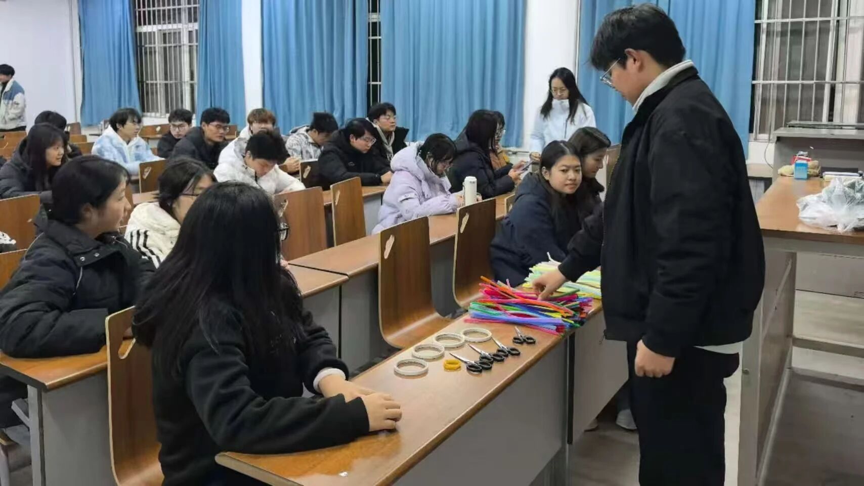 活动伊始,工作人员分发色彩丰富的扭扭棒材料,并详细讲解手工制作技巧与注意事项。现场氛围十分活跃,同学们兴致高涨,不仅认真聆听讲解,还主动在网上查找相关教程进行学习。